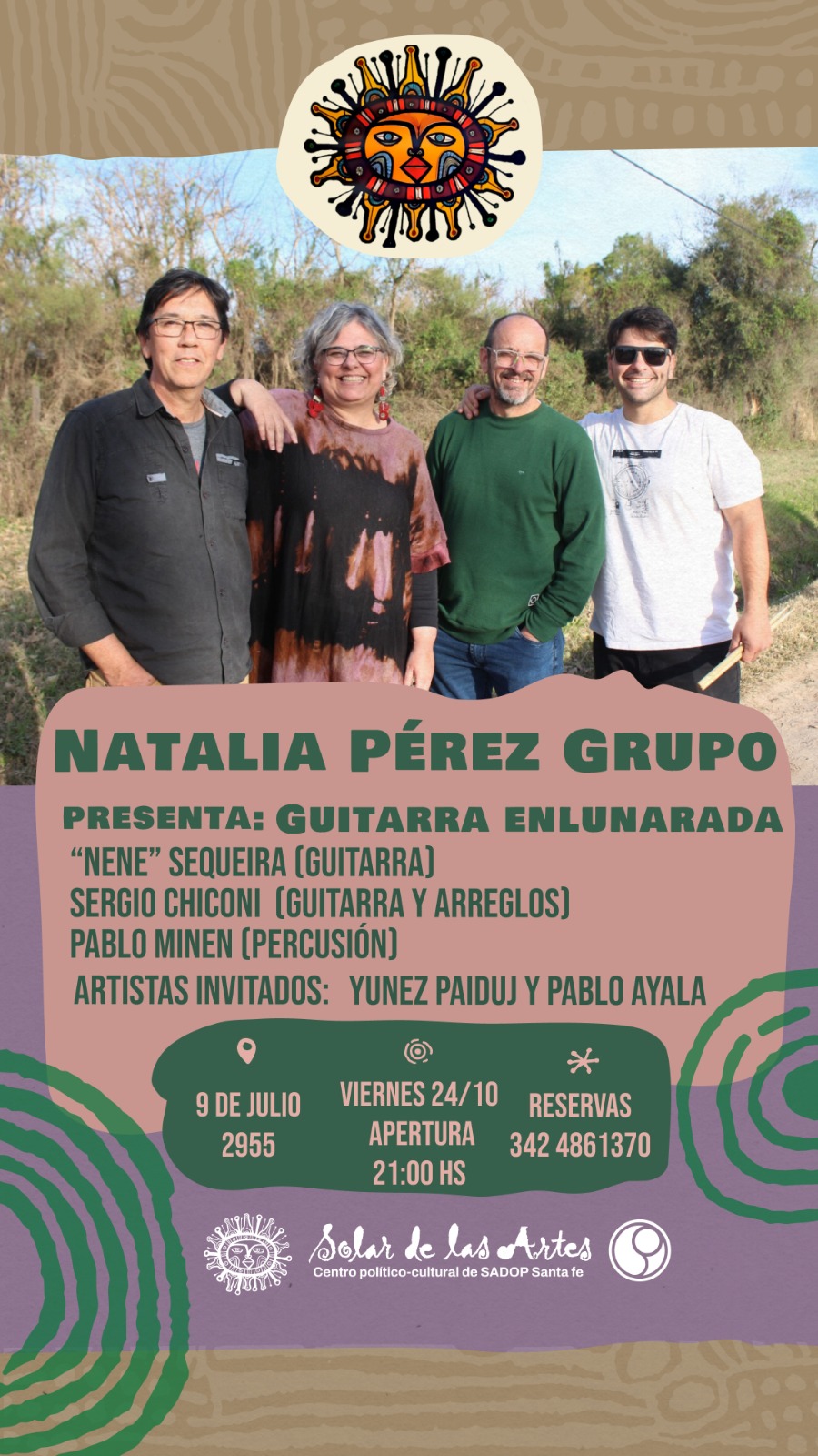 24 de Octubre de 2025 - 21.00HS NATALIA PEREZ, JUNTO A GRANDES MÚSICOS, "Guitarra enlunarada". El próximo viernes 24 de octubre se presenta el espectáculo "Guitarra enlunarada".La música sigue su cauce y nos vuelve a reunir junto a dos grandes artistas invitados: Yunez Paiduj y Pablo Ayala. Integrantes Nati Perez (voz), Sergio Chiconi (guitarra y arreglos), “Nene” Sequeira (guitarra) y Pablo Minen (percusión). |