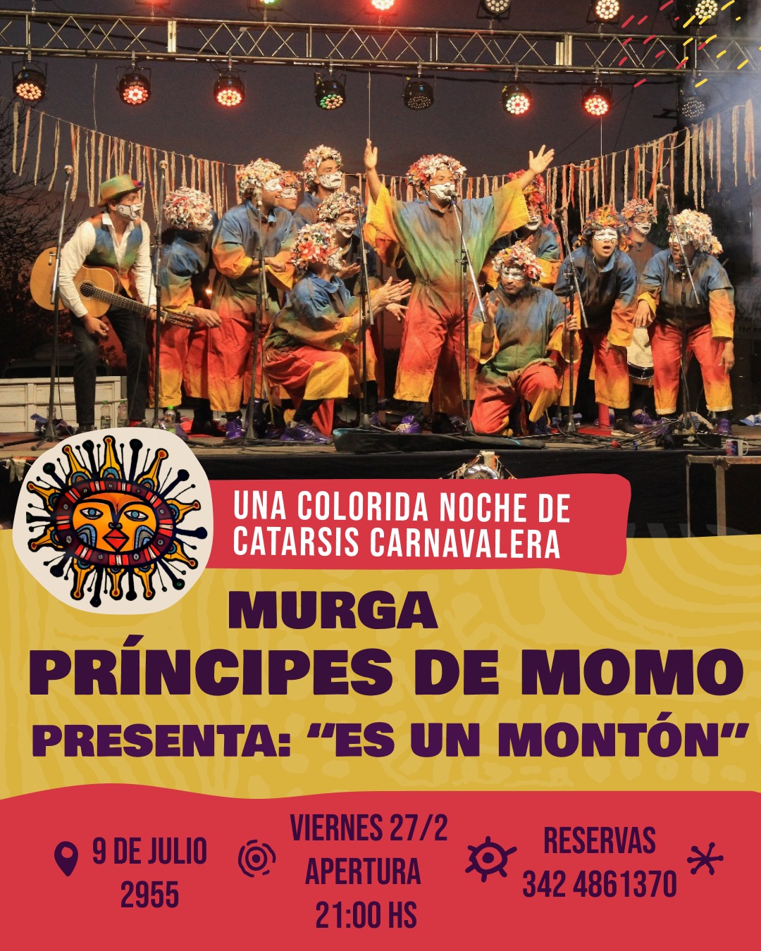 El próximo viernes 27 de febrero se presentará la murga Príncipes de Momo con el espectáculo "Es Un Montón”, donde se combina el humor ácido, la ironía filosa y la potencia musical para ofrecer una sátira mordaz de la sociedad actual. Con más de 21 años de trayectoria y crecimiento, los Príncipes de Momo nos invitan a reflexionar sobre diferentes aspectos de nuestra cultura en lo que será una colorida noche de catarsis carnavalera.