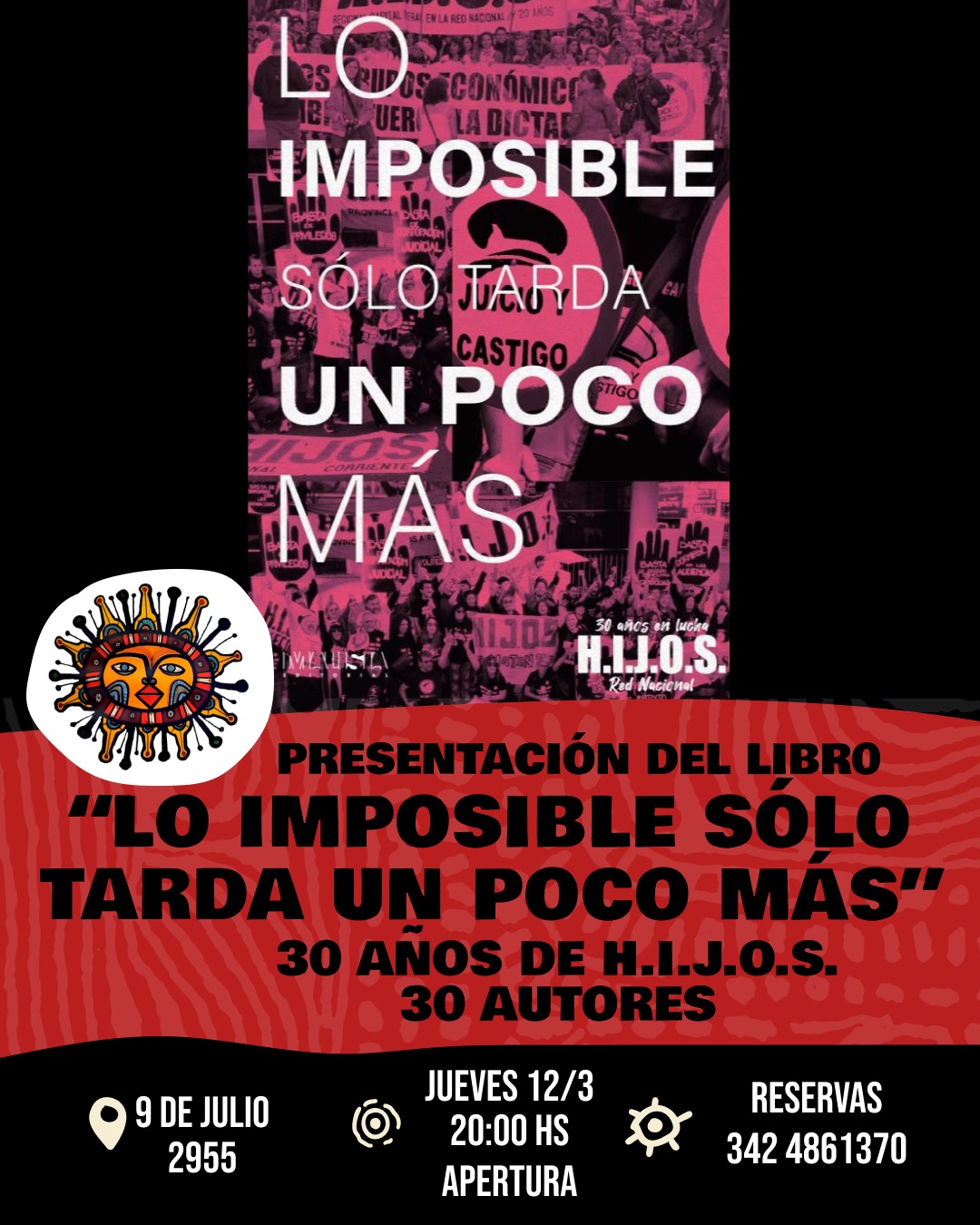 El próximo jueves 12 de marzo H.I.J.O.S. Santa Fe presentará el libro "Lo imposible solo tarda un poco más" donde participaron 30 autores y autoras. Será un momento para reflexionar y compartir recuerdos junto a quienes han acompañado a la organización en sus 30 años de existencia.