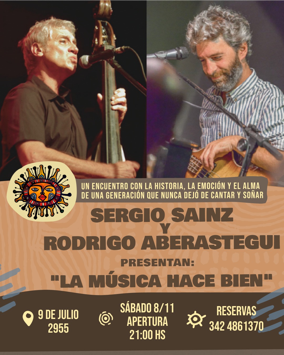 08 de Noviembre de 2025 - 21.00HS Sergio Sainz y Rodrigo Aberastegui: "La Música Hace Bien" Sergio Sainz y Rodrigo Aberastegui presentarán "La Música Hace Bien" un encuentro con la historia, la emoción y el alma de una generación que nunca dejó de cantar y soñar.Sergio Sainz es compositor y cantante, y forma parte de la llamada trova rosarina desde Tiempos Difíciles junto a Baglietto, Fito Paez, Silvina Garré, Rubén Goldín y Zapo Aguilera. Rodrigo Aberastegui es compositor, cantante, y productor musical. "Seguir cantando es un acto de memoria y de vida. Cada canción es un hilo que nos mantiene conectados, y este encuentro es un recordatorio de que la música nos hace bien, ahora y siempre”. |