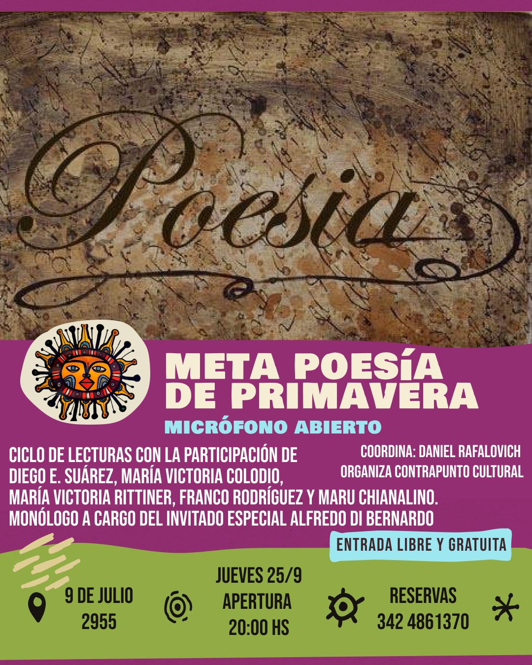Nueva edición de MetaPoesía de Primavera. En esta oportunidad contaremos con la participación de Diego E. Suárez, María Victoria Colodio, María Victoria Rittiner, Franco Rodríguez y Maru Chianalino.