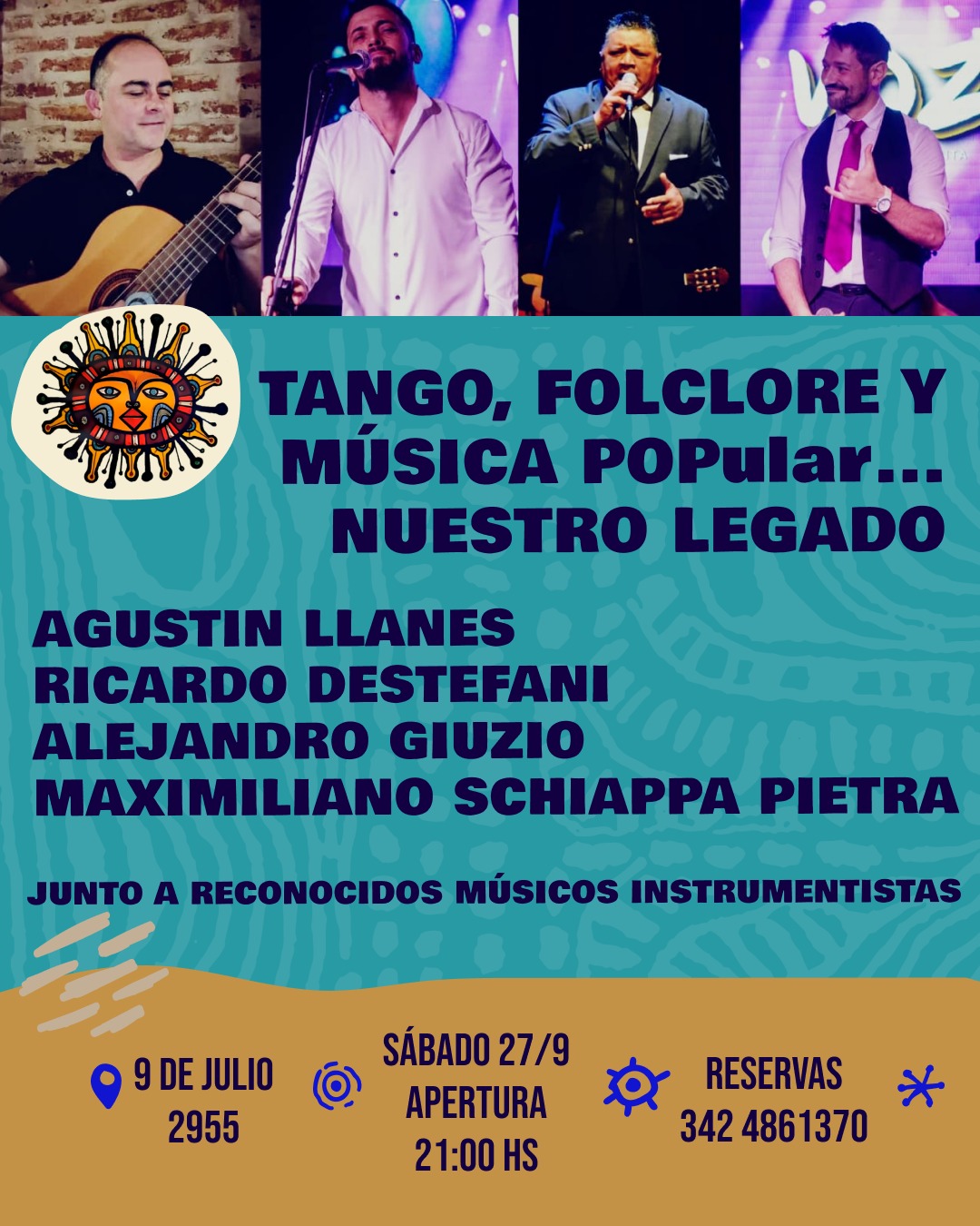 se presentará una propuesta musical que integra diversos géneros donde Agustin Llanes, Ricardo Destefani, Alejandro Giuzio y Maximiliano Schiappa Pietra junto a reconocidos músicos instrumentistas, nos acercarán el espectáculo “Tango, Folclore y música POPular… nuestro legado”. La invitación invita a sumergirnos en el camino de la historia musical de cada uno de estos cuatro cantantes con un repertorio versátil e innovador.