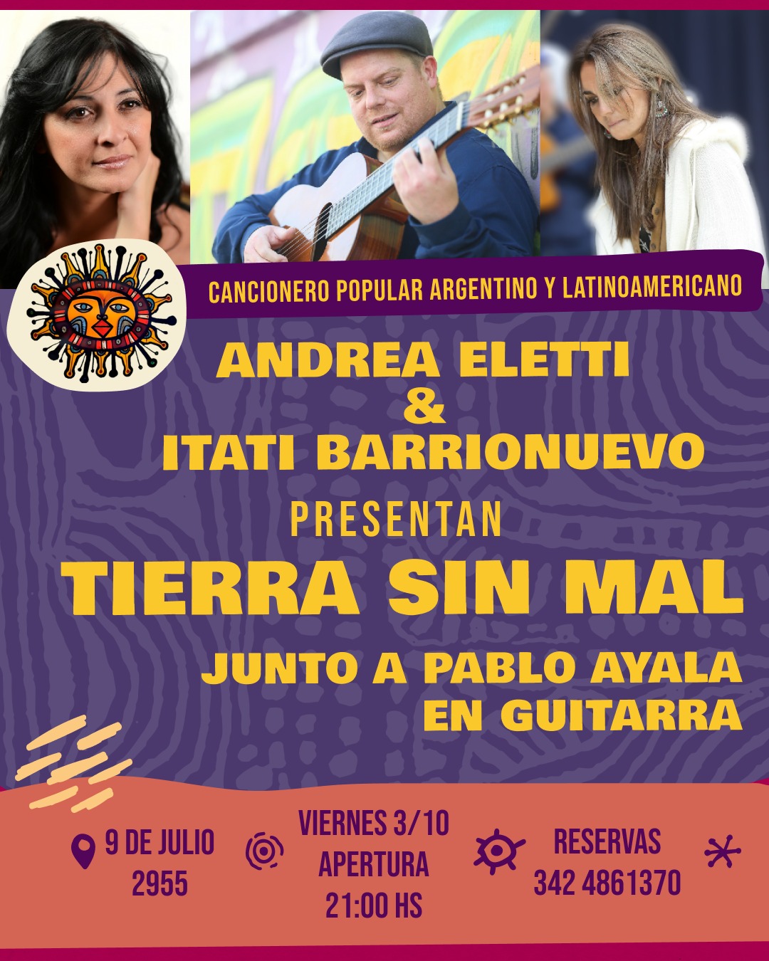 Andrea Eletti e Itati Barrionuevo junto a Pablo Ayala en guitarra presentarán el espectáculo "TIERRA SIN MAL", un recorrido musical por el cancionero popular argentino y latinoamericano. Interpretarán obras de Peteco Carabajal, Homero Expósito, Tata Cedrón, Victor Jara, Violeta Parra, Fernando Cabrera, entre otros.