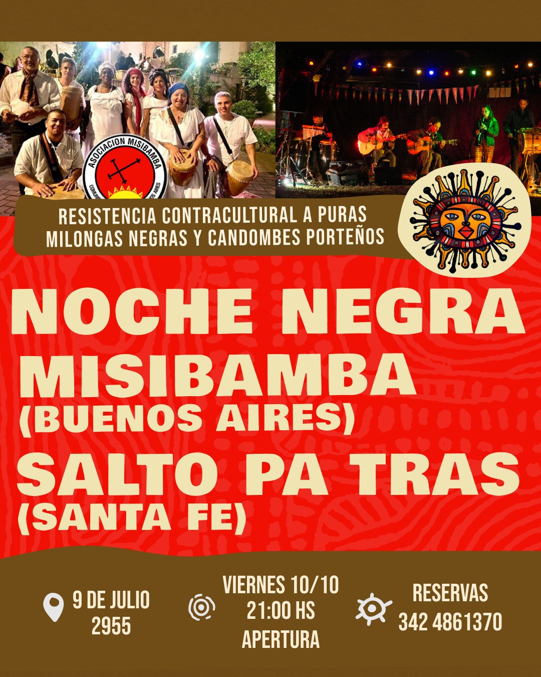 Desde Buenos Aires contaremos con la presencia de "Misibamba," una agrupación artística que reúne toques de tambores, cantos y bailes perteneciente a la comunidad afroporteña, cantando sus saberes a través de los candombes porteños. Desde Santa Fe llega "Salto pa'tras" con su milongas negras, trayendo la negritud y la reflexión sobre la cuestión racial.