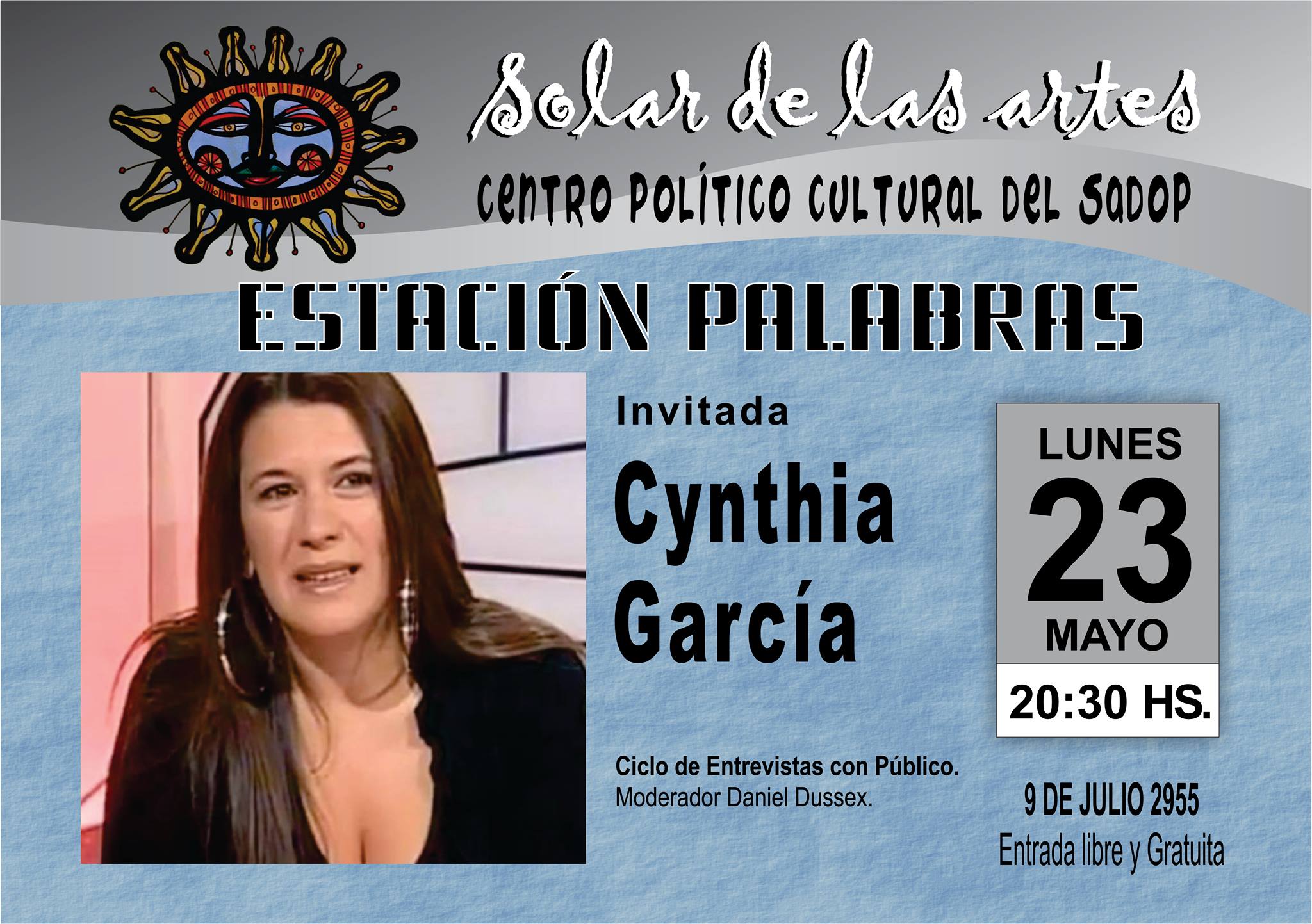 Ciclo de entrevistas con público organizado por SADOP para conversar sobre Cultura, política y Comunicación. En esta ocasión estará como invitada la periodista Cynthia García, de reconocida trayectoria en medios televisivos y radiales. Ha sido panelista del programa 678, ha trabajado junto a Víctor Hugo en radio del Plata y también en radio Nacional. En estos momentos tiene un canal alternativo en las redes donde continúa realizando coberturas periodísticas y desplegando su estilo personal de análisis.